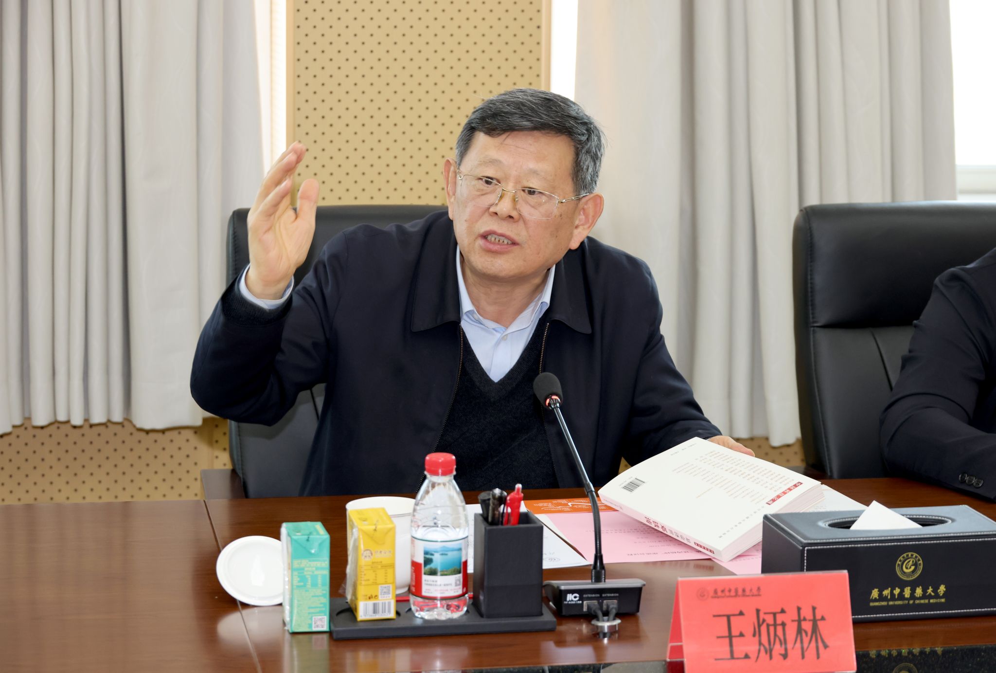 王宏斌对王炳林教授来校调研交流表示热烈欢迎。他指出,2024年是广州中医药大学建校100周年,2026年恰逢新中国中医药高等教育70周年和邓铁涛教授诞辰110周年。回顾邓铁涛教授的一生,他作为一位中医临床家、理论家、教育家和中医发展的战略家,通过五次建言上书,对中医药的传承发展起到了关键性的历史作用。他强调,多年来学校的发展离不开邓铁涛教授的引领,本次开展座谈会既是为了深切缅怀邓铁涛教授的崇高风范,传承其济世初心与学术思想,凝练并弘扬“铁涛精神”,同时也以此为契机回望中医药高等教育发展历程、为发展中医药事业凝聚力量。